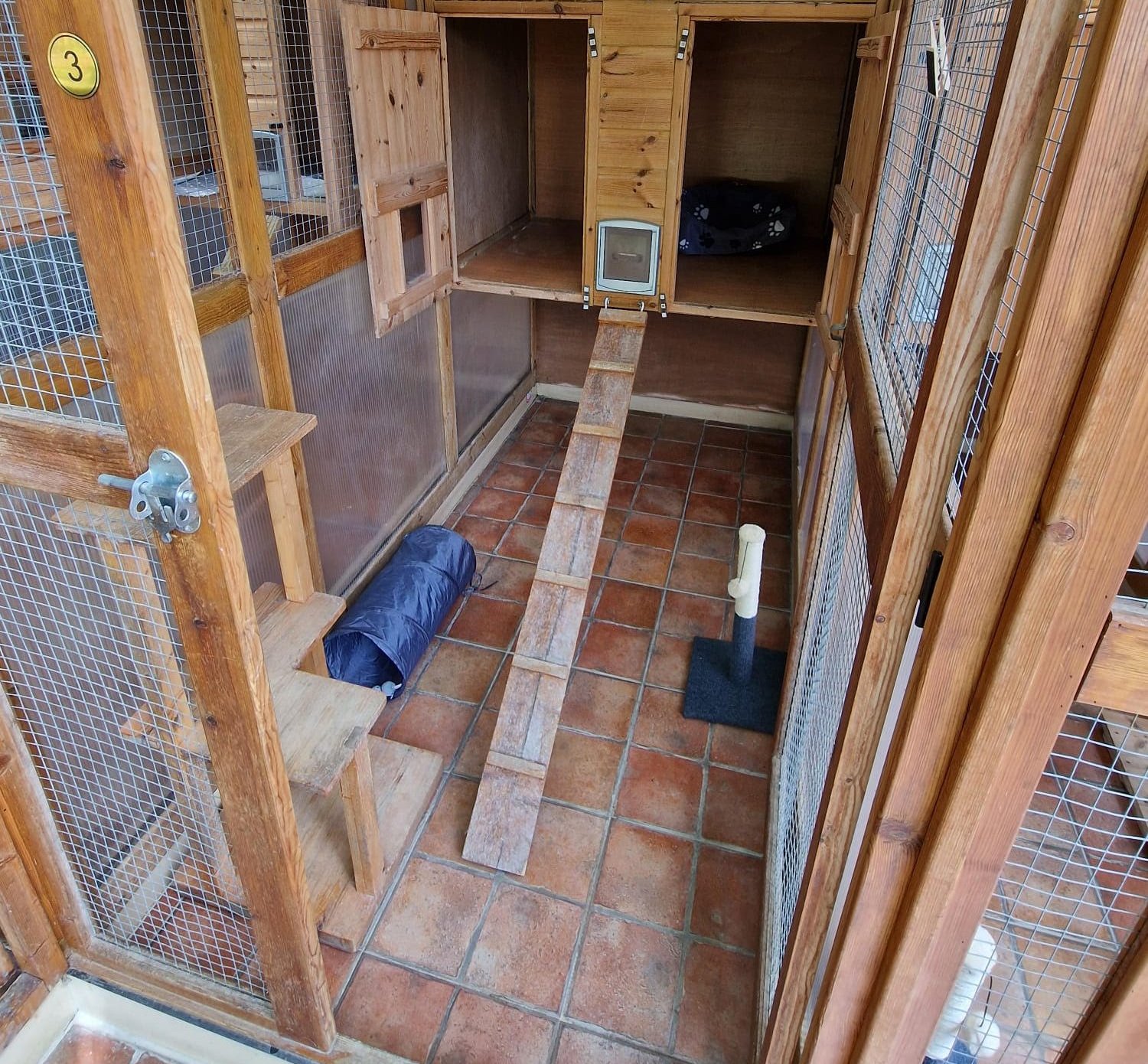 Each of our pens has its own private covered exercise area with a exploration shelf which includes a built in ramp down to floor level to aid elderly cats. The pens are accessed via a covered safety corridor which runs the length of the cattery and ensure the safety and security of your cat during their stay.